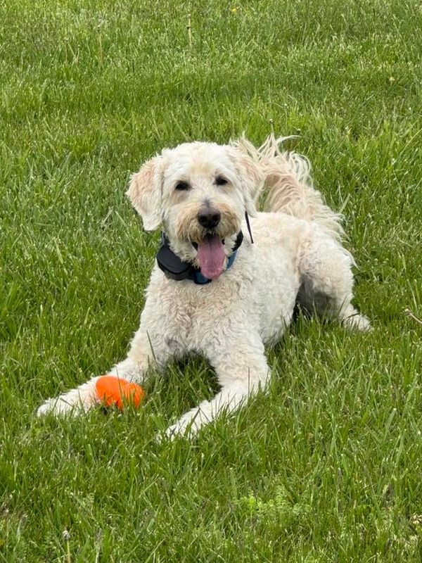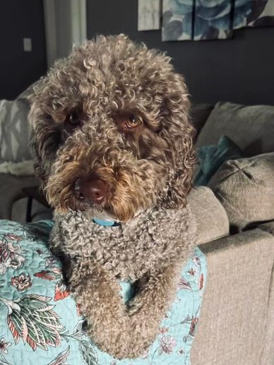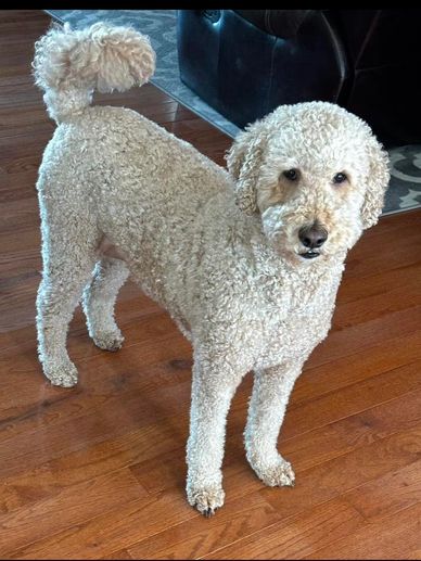 This is our Brody who will be 11 in August. Brody is the sweetest boy and has been a wonderful addition to our family! He joined our family when 3 of our 4 kids still lived at home and is now enjoying time with our 2 young grand daughters when they are here!! Brody has the best temperament with everyone and was so easy to train. As he’s aged he continues to be the sweetest cuddly boy he was as a puppy! I remember when Cara brought him along with another female puppy to our home so we could decide which one was the best fit with our other Goldendoodle Charlie! I had my heart set on getting a female until I met Brody… he climbed in my lap and snuggled in while the female puppy ran all over the yard and the kids could hardly catch her!! I could tell Cara was seeing a connection with Brody to all of us when she told me that “Brody” was very loving and would bond quickly, that was an understatement for sure!! He rarely will leave my side yet always shows the same bond and love to every family member, friend, and even strangers! We hit the jackpot with Brody and we’re forever grateful to Cara for the care she gave prior to him joining our family. Her ability to know her puppies so well and match them to the right forever homes is a gift!